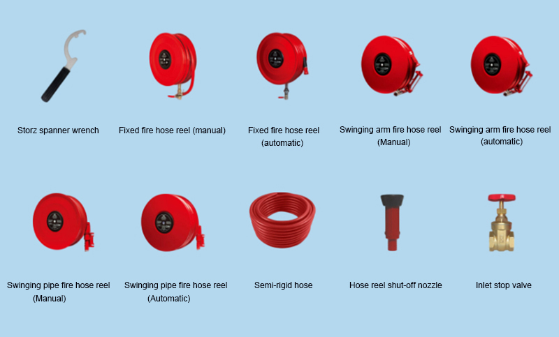 Fixed fire hose reel (Manual) is normally installed in a building for the occupants to extinguish a small fire. It could not swing. For manual type, it is controlled by an external manual valve to release water into the hose.